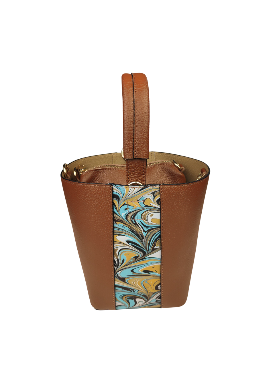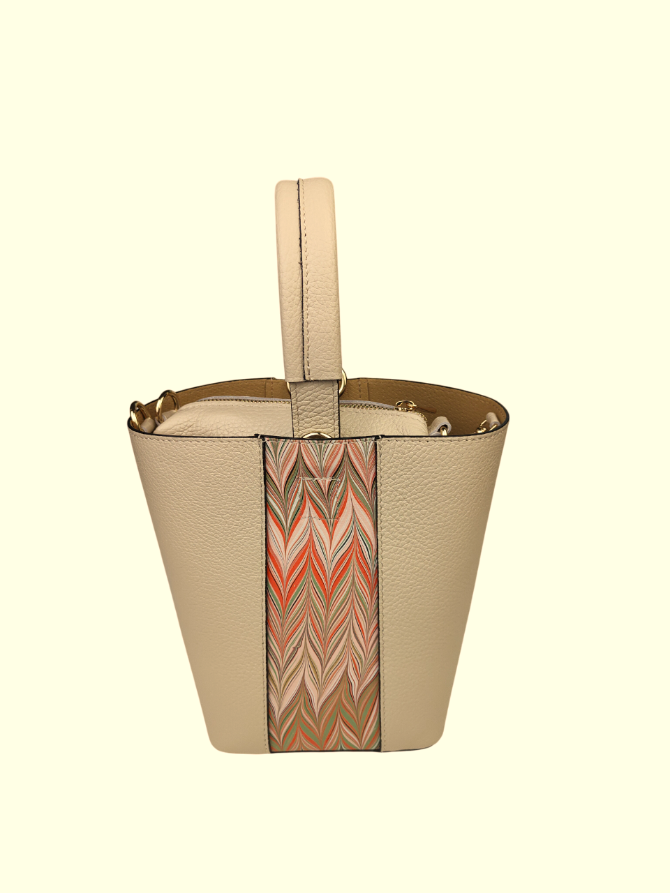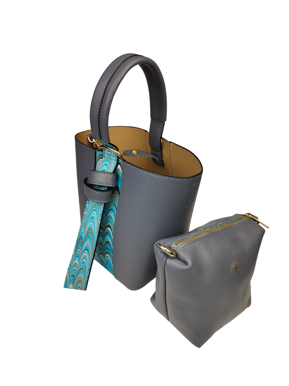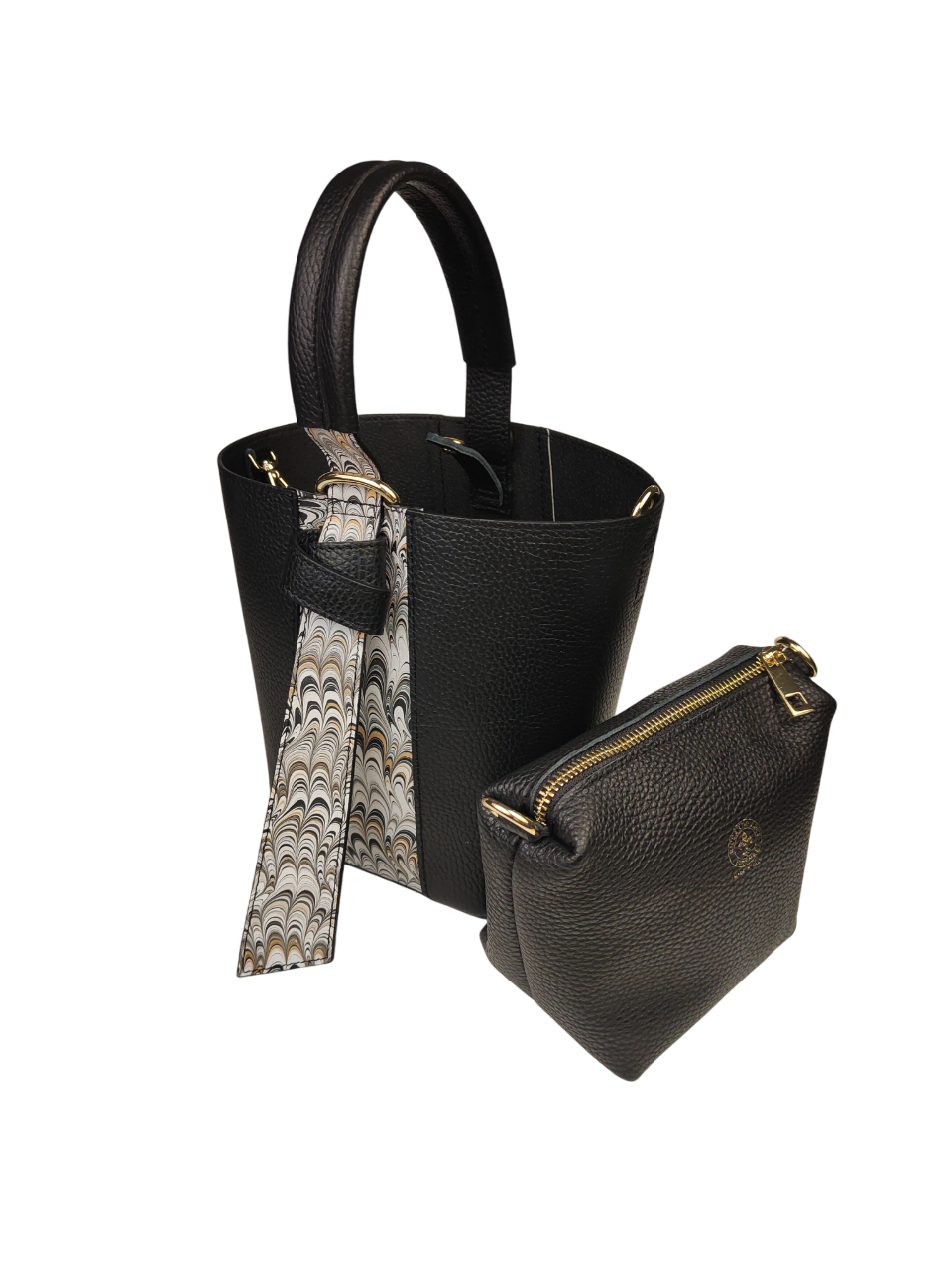 Elegante set composto da borsa e pratica pochette coordinata. Originale design a secchiello, arricchito da inserzioni decorative in pelle marmorizzata che le donano ricercatezza e personalità. La borsa presenta un comodo manico, tracolla regolabile e rimovibile in pelle con cuciture a vista. Ampio spazio interno in cui può essere contenuta la pochette coordinata.