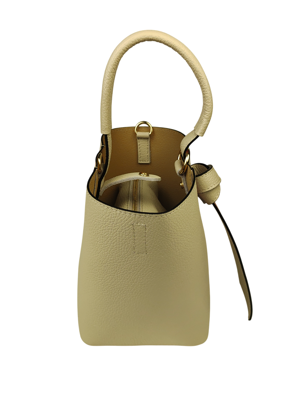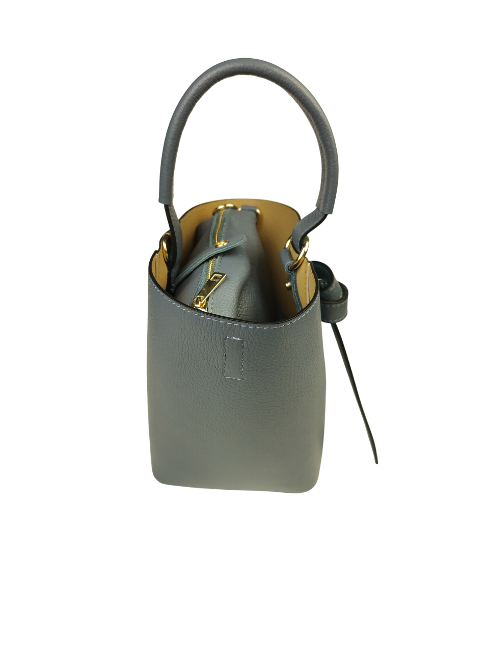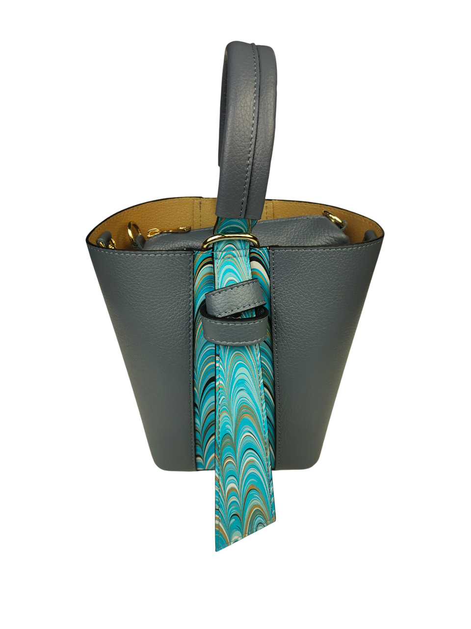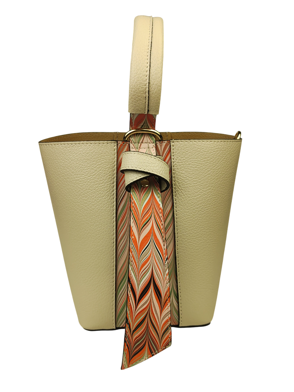 Elegante set composto da borsa e pratica pochette coordinata. Originale design a secchiello, arricchito da inserzioni decorative in pelle marmorizzata che le donano ricercatezza e personalità. La borsa presenta un comodo manico, tracolla regolabile e rimovibile in pelle con cuciture a vista. Ampio spazio interno in cui può essere contenuta la pochette coordinata.