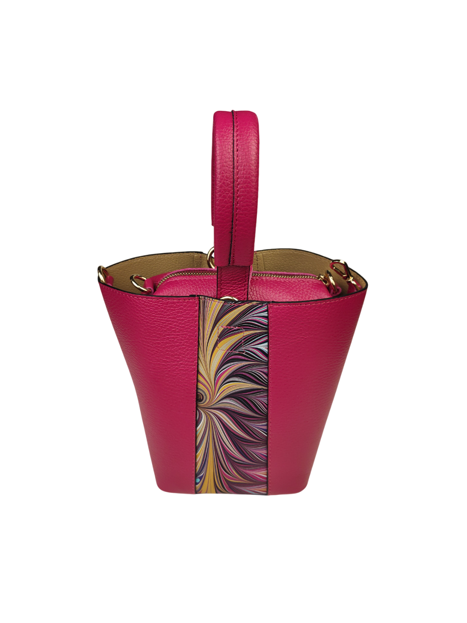 La caratteristica esclusiva di questa borsa sono le inserzioni in pelle marmorizzata, creata in modo artigianale esclusivamente da Riccardo Luci nella sua bottega. La marmorizzazione è un’antica tecnica di decorazione tipica della legatoria fiorentina rinascimentale che normalmente può essere eseguita solo su carta. Riccardo Luci ha trasferito questo metodo di decorazione artigianale anche sulla pelle, rendendo ogni accessorio di questa linea unico ed irripetibile. Per questo ogni oggetto realizzato con questa tecnica è unico, impossibile da ricreare in modo uguale.
